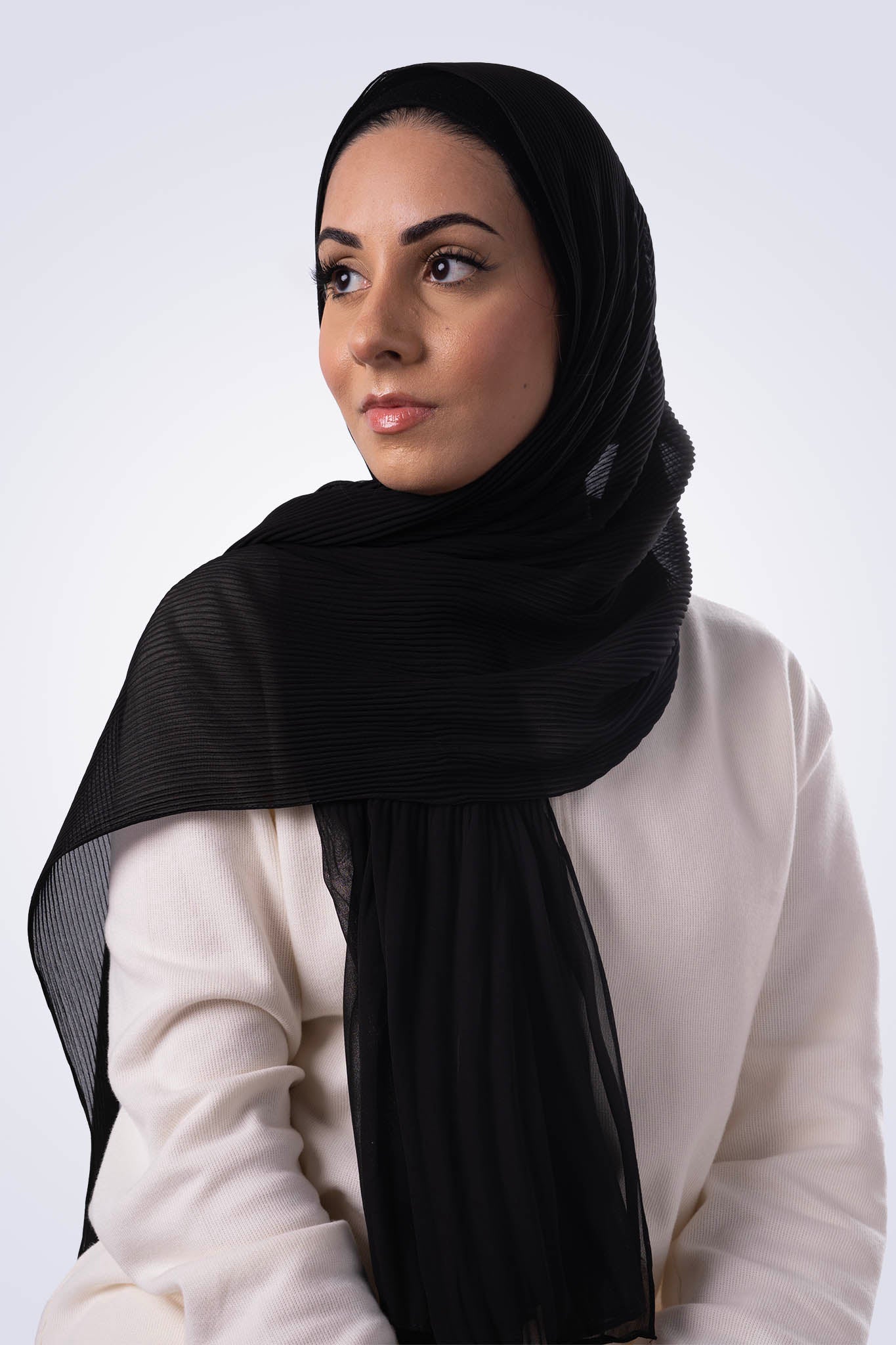 Elevate your style with our unique pleated chiffon hijab: a wardrobe essential that effortlessly enhances any outfit. From finely gathered pleats, the fabric gracefully transitions into broad, flowing folds, creating an elegant and lightweight drape.
